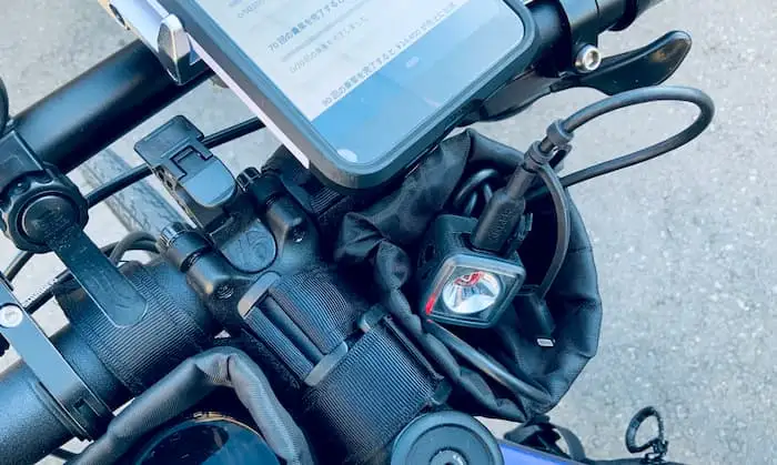 ハンドルバッグ2個着けたりでハンドル周りにスペースがない。なので延長ブラケットにスマホとフロントライトを着けることにした。あ~スッキリ。