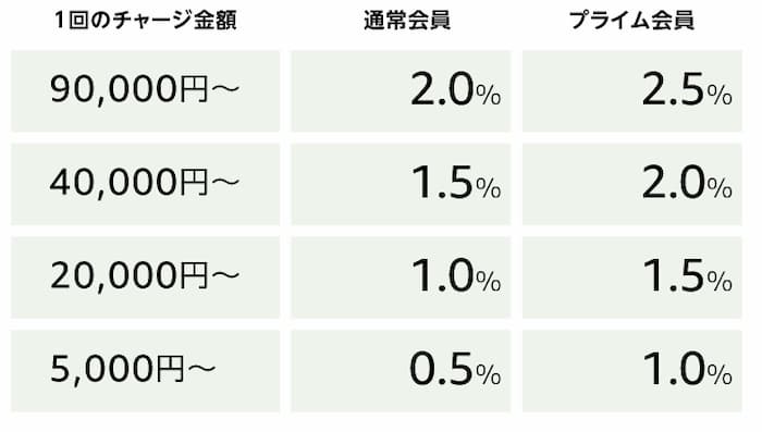 プライム会員なら20,000円で300ポイントもらえる。コンビニでもATMでもネット銀行からでも5000円からチャージできる。