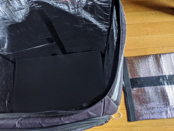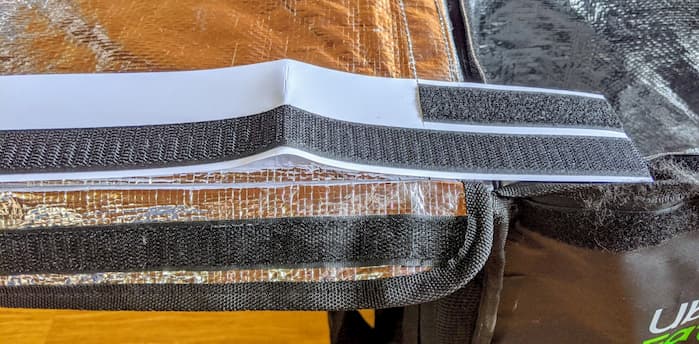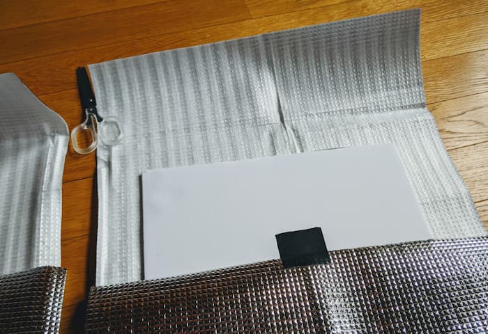 きっちりアルミシートをボードに沿わせて貼ろう。ブカブカでも問題ないけど。気をつけるのは、マジックテープを取り付ける面はテープ分の幅を余分に確保しておくということ。