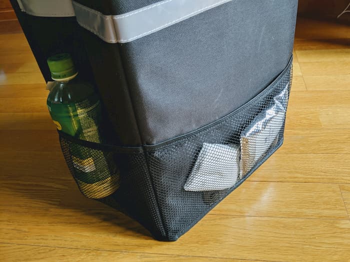メッシュポケットが背中側以外の面に全部ついている。細々とした小物やエチケットグッズ、ペットボトルなどを入れるのにいい。