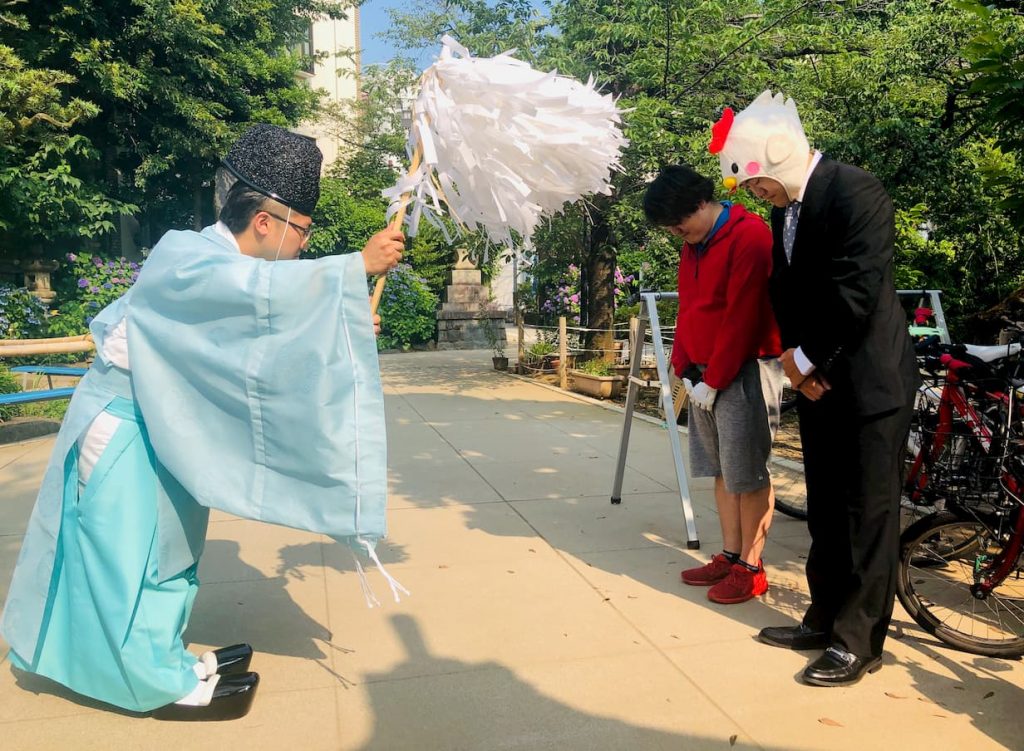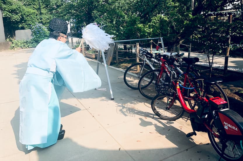 自転車置き場での祈祷ももちろん神様へ捧げるものだから撮影、録音、録画、アップロード禁止。今回は許可を取り、祈祷後にブログに使うようにポーズだけとってもらい写真を撮らせていただいた。