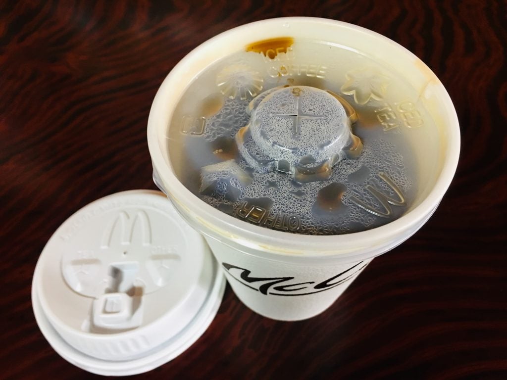 ちなみに、ホットドリンクはコールドの蓋にホットの蓋で2重。なので蒸気口から吹きこぼれることもない。ホントにマックは最高に考えられている。