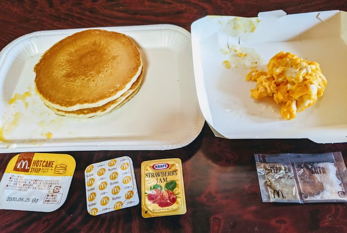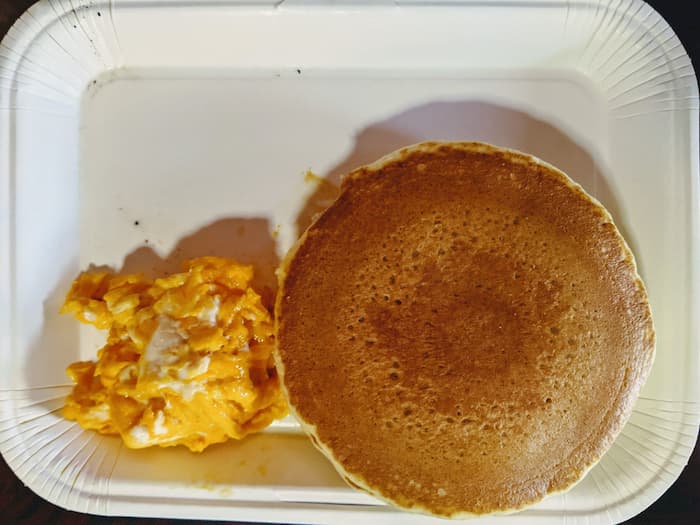 下準備として1枚のプレートに避難させておいたスクランブルエッグとホットケーキをお別れさせる。