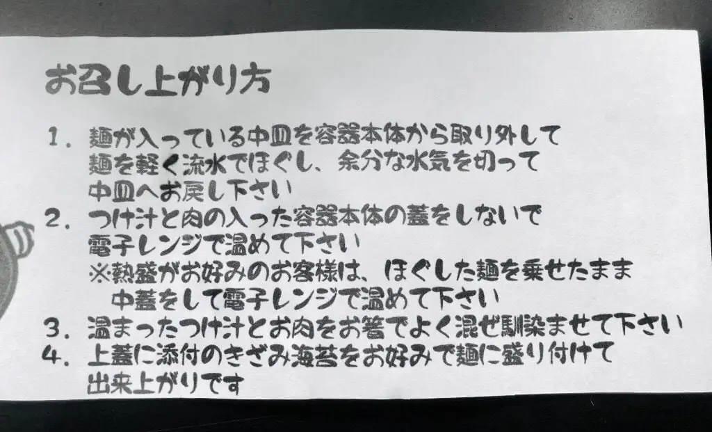 意気揚々と肉汁つけ麺を注文したものの、自宅に電子レンジがないことを失念していたという痛恨のミス。