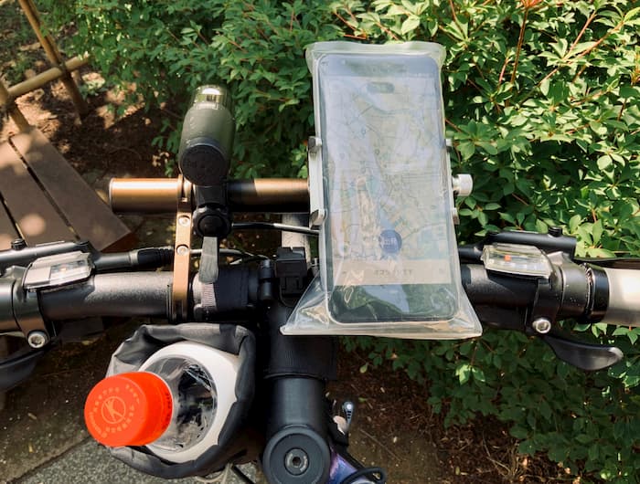 ジップロックや防水クリアケースを着けてその上からスマホホルダー使用する方法もある。かなりお手軽。
