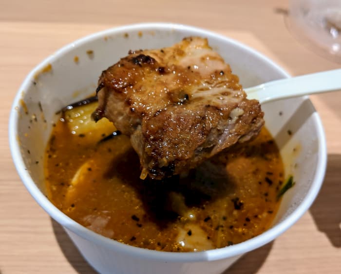 見るからに美味しそうな角煮をスープカレーの海から取り出す。この大きさが2個入ってます。感想?