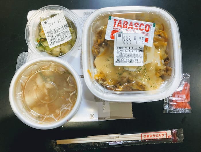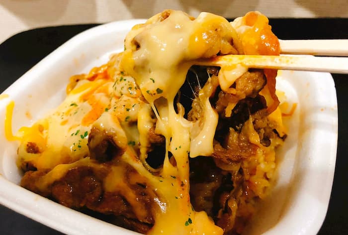 濃厚なチーズと甘辛の牛丼つゆが絡み合い、タバスコがアクセントとなって味覚を刺激するッ!!!