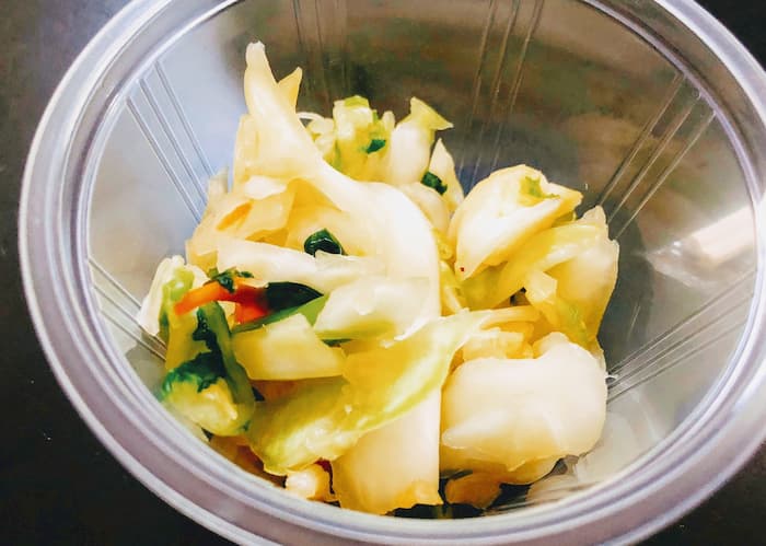 さらにセットのおしんこが、コテコテのチー牛に対する絶妙な清涼剤となってくる。
