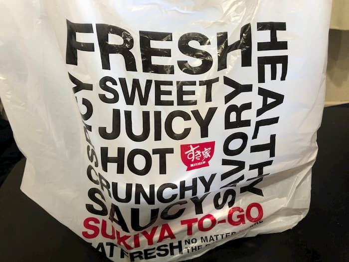 すき家の持ち帰りはコレ。謎の英語ビニール袋。フレッシュ?ヘルシー?ホワイ!