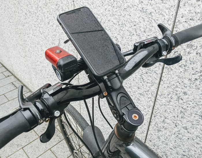 スマホホルダーはTigraスポーツのオサレ高額ワンタッチ着脱のヤツ。