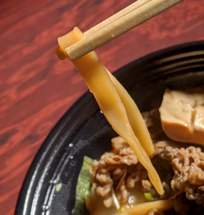 平たいうどん。食べやすさを考えて短いのかもしれない。味は普通。