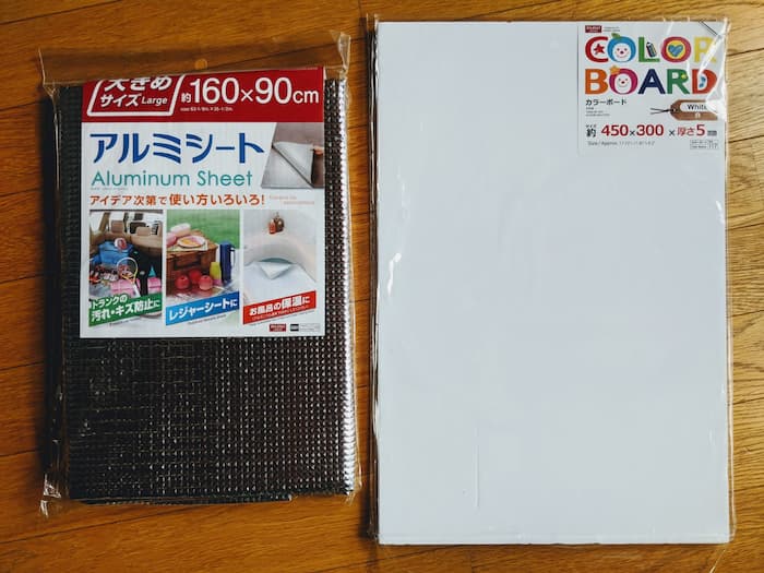 100円ショップで軽い板とアルミシートを購入。ガムテープも必要だ。