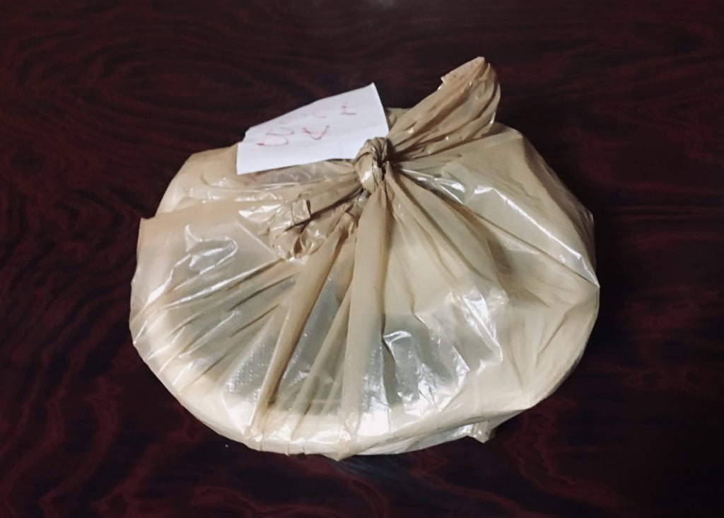 容器にビニール袋の状態で届く。上についている紙は注文番号だ。