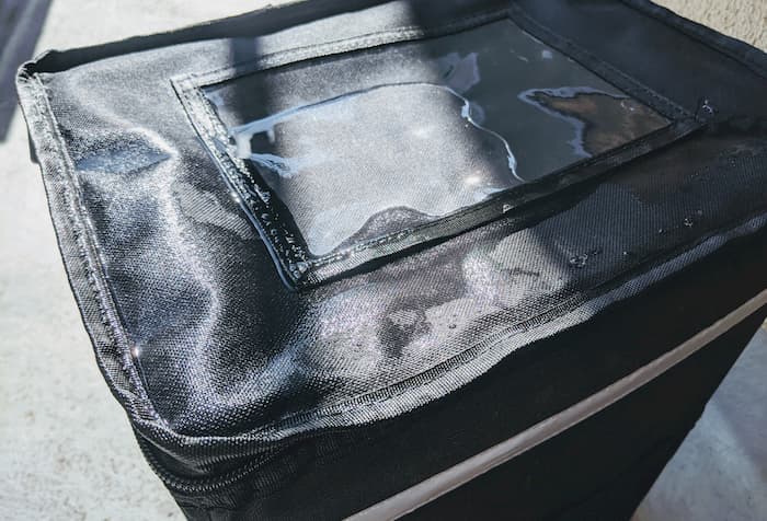 裏地がアルミなので表面が浸水しても濡れないのでは?と思う人もいるだろうが、しみ込んだ水はジッパーをつたい内部が濡れる。
