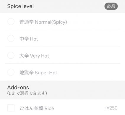辛いのが苦手な人も大丈夫。アプリの注文時に4段階で選べます。