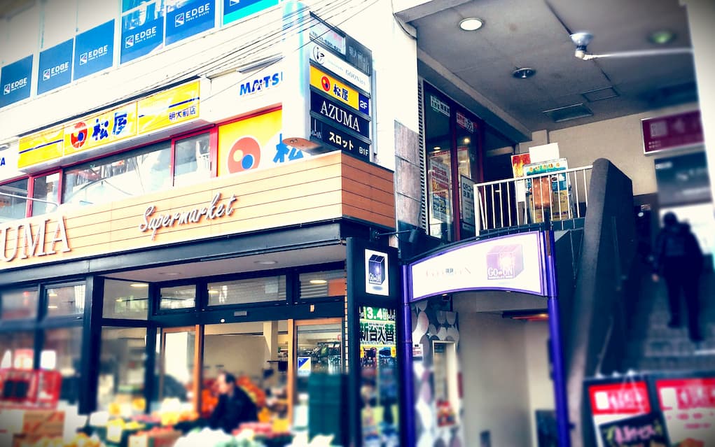 甲州街道沿いの加盟店「すが田」の角を曲がり、駅に向かう通りのある。ガストを通り過ぎると「すた丼」、通りの端の向かい側の2階に「松屋」がある。