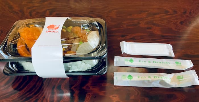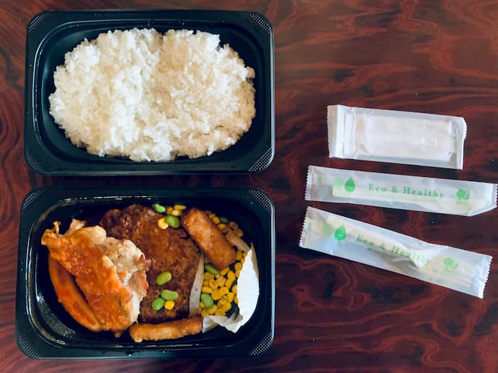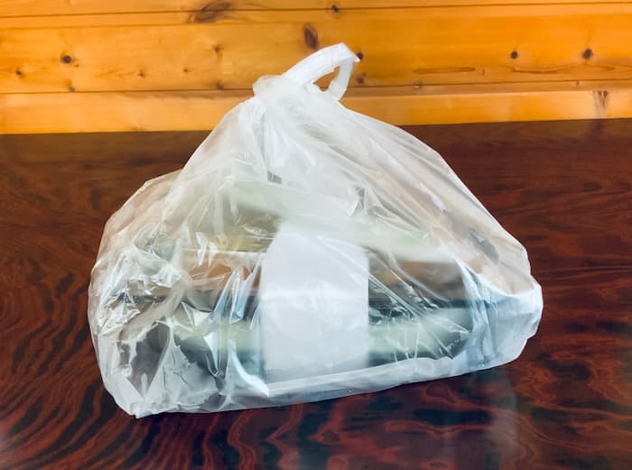 弁当にビニール袋のシンプルな梱包。