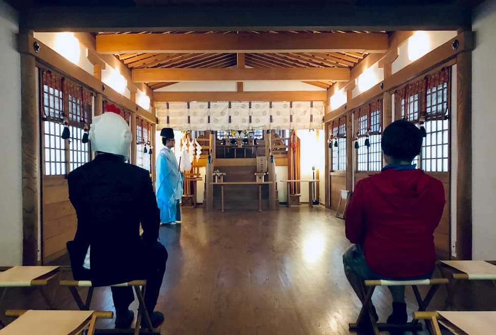神社内(御社殿)に入り、靴を脱ぎあがる。荷物も置くところあるので大丈夫。料金を支払い祈祷スタート。