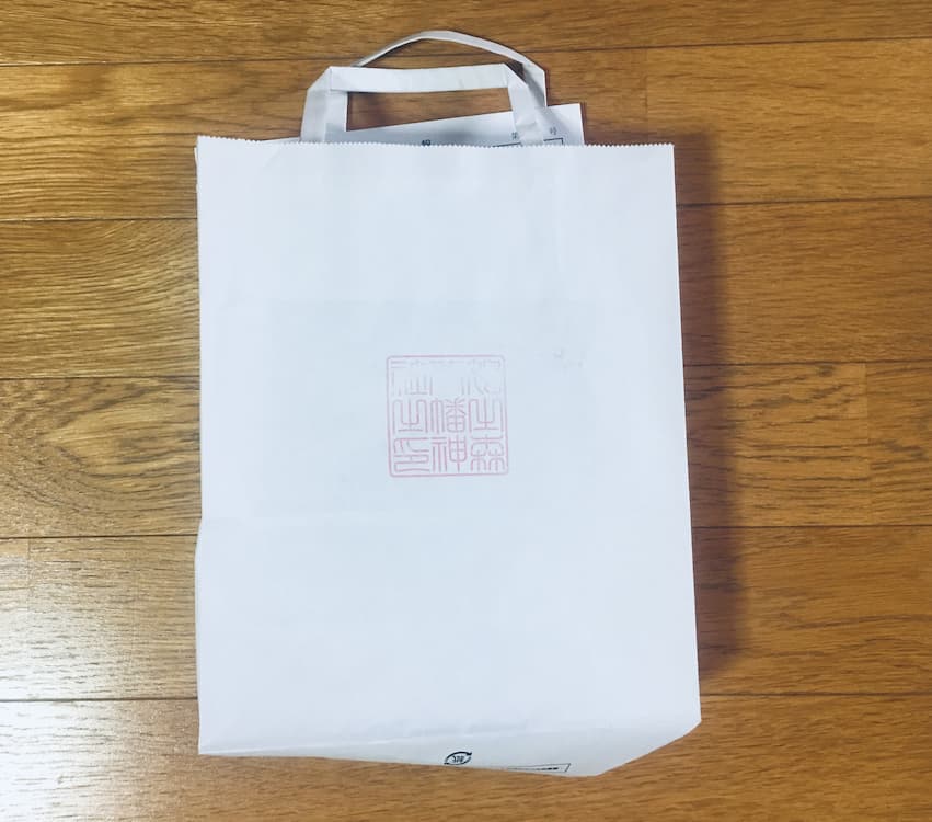 祈祷後、紙袋をもらえるのを知らなかった。中をみたら500円の御守りと500円のステッカーが入ってる!