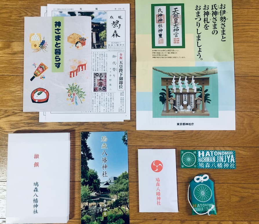左下:飴 冊子3冊と社報2冊 右下:封筒(中にお守りとステッカー)