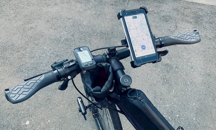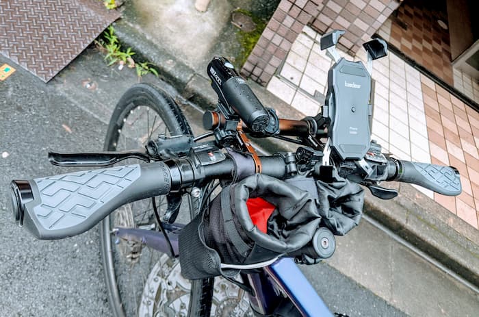 ハンドルからライトが無くなり随分すっきりして、配達に必至のスマホホルダーとサイコンだけになった。