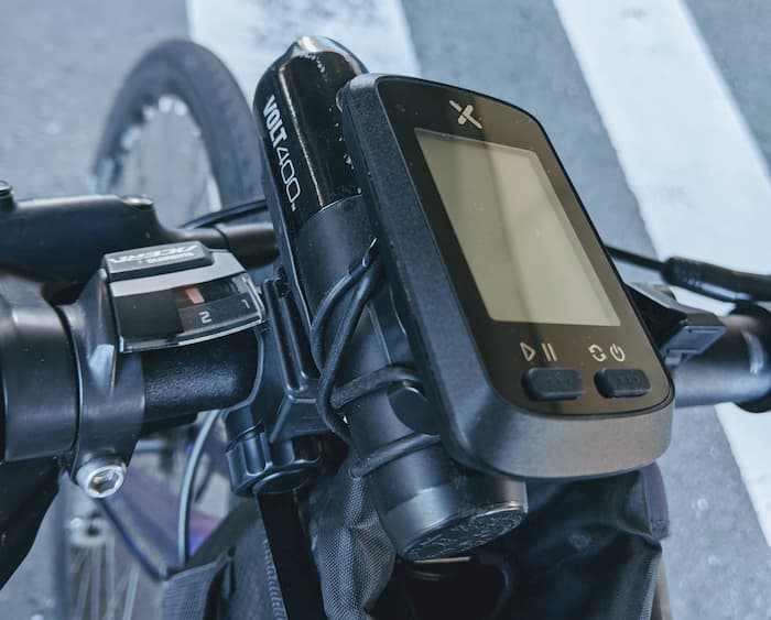 サイクルコンピューターは安くて機能十分なXOSSで。ストラバとも簡単連携でしっかりログを残せる。日々の走行チェックに。