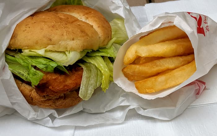 チキンは柔らかく加工されていて食べやすい。レタスはではなく千切りキャベツでカツとの相性は◎