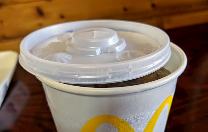 ちなみに、ホットドリンクはコールドの蓋にホットの蓋で2重。なので蒸気口から吹きこぼれることもない。ホントにマックは最高に考えられている。
