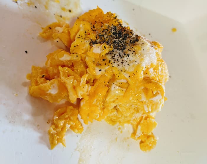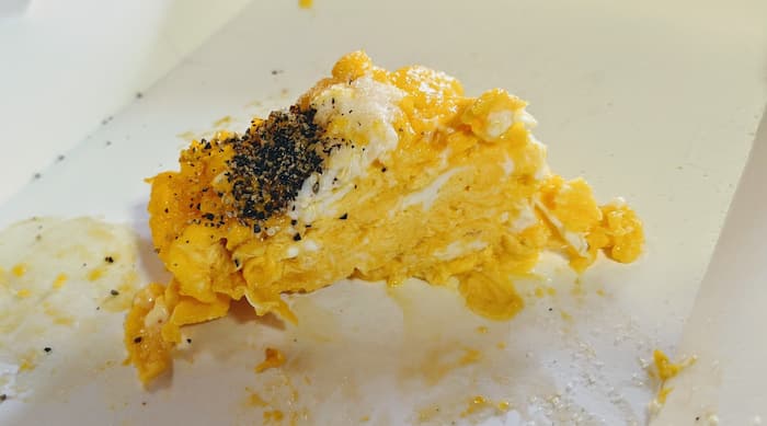スクランブルエッグにかける。このスクランブルエッグ、硬さが絶妙。