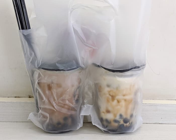 2つ頼むと2口に別れるビニール袋で梱包するため、タピオカが袋の中で暴れることも無い。このビニールはポイント高い。