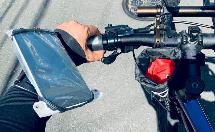 ジップロックや防水クリアケースを着けてその上からスマホホルダー使用する方法もある。かなりお手軽。