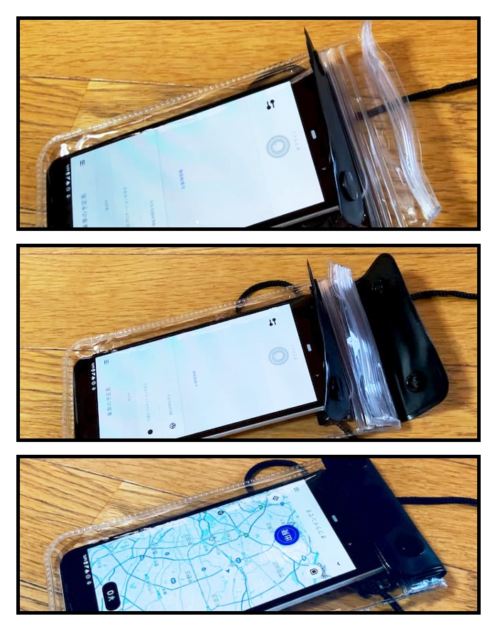不満なら自分に合った防水スマホケースを探すか、ジップロックを使用し普段使ってるスマホホルダーを使う。