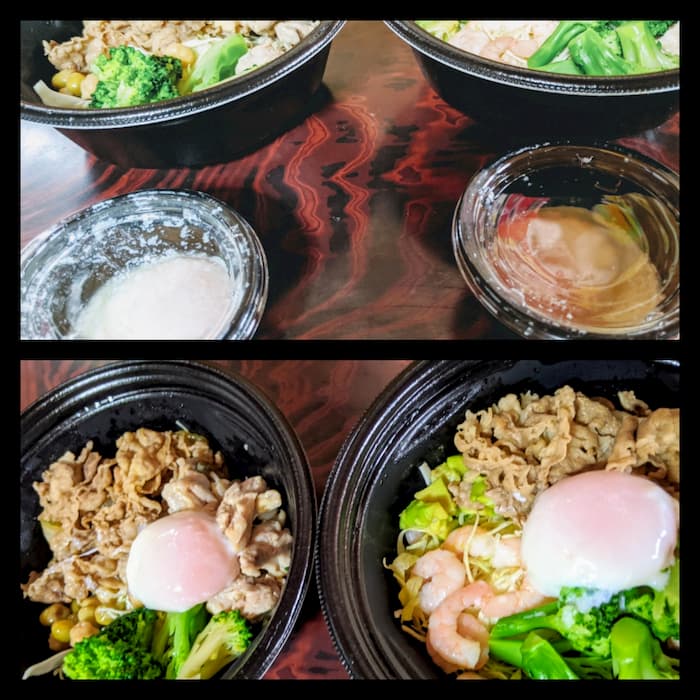 卵が別容器なのはgood。どんぶりに一緒に入ってたら配達中に振動でぐちゃぐちゃになっちゃうから。