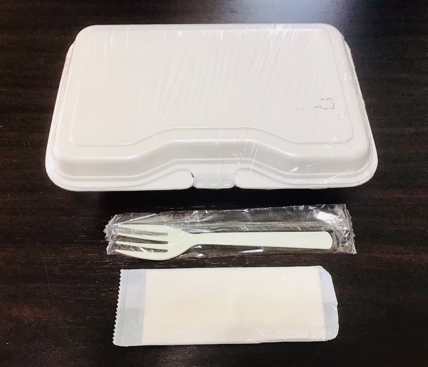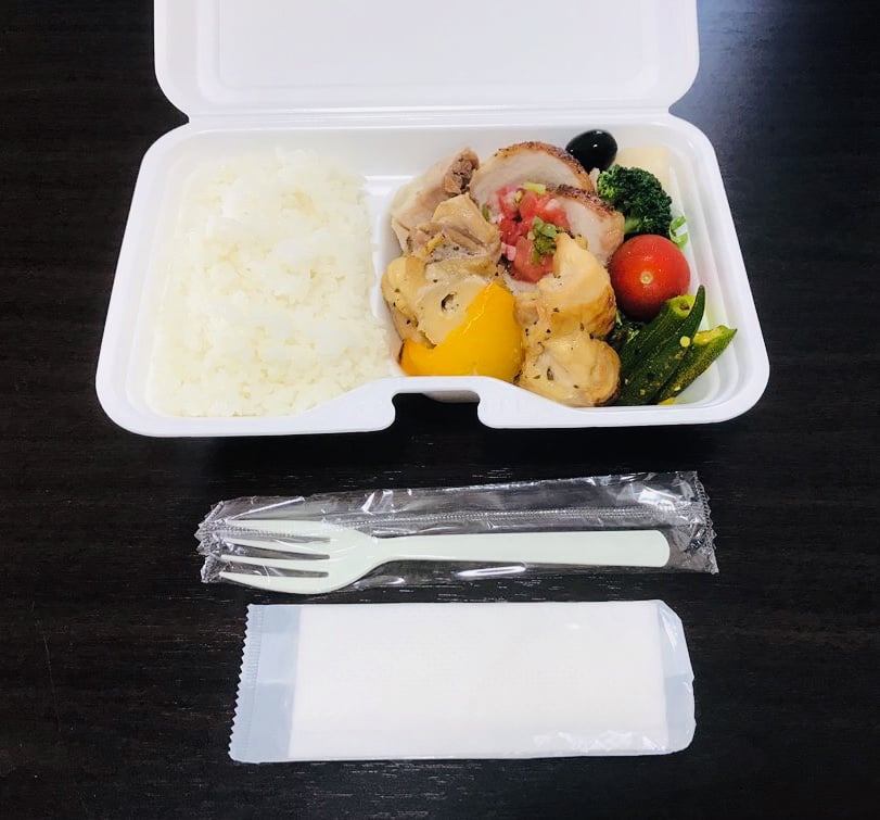 ビニール袋に弁当ボックス、フォーク、お手拭きが入ってる。