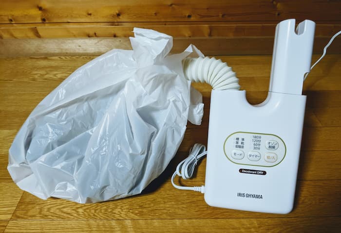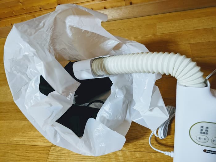 靴や靴下、マスクの脱臭のことばっかり考えて配達バッグの事をすっかり忘れていたが、このホースなら簡単に差し込んで脱臭できる。最高!