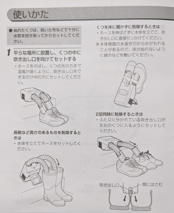 ホースの口の形状に注目。溝がある。靴を左右合わせて乾かせる。