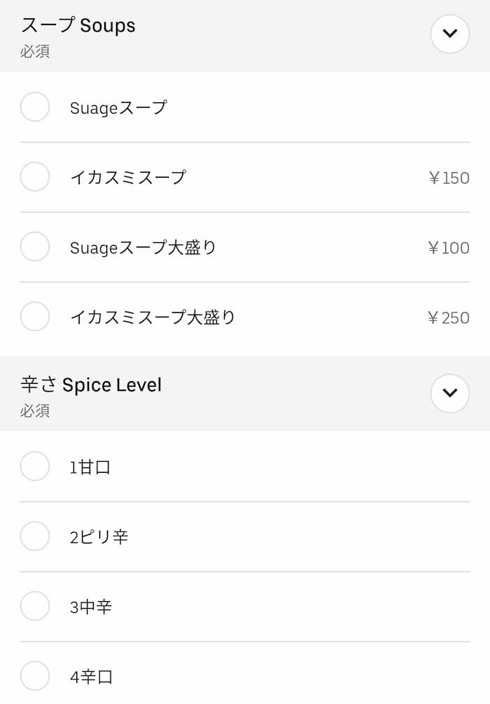スープの量、辛さを細かく選べる。辛さは10段階まで選択可能。