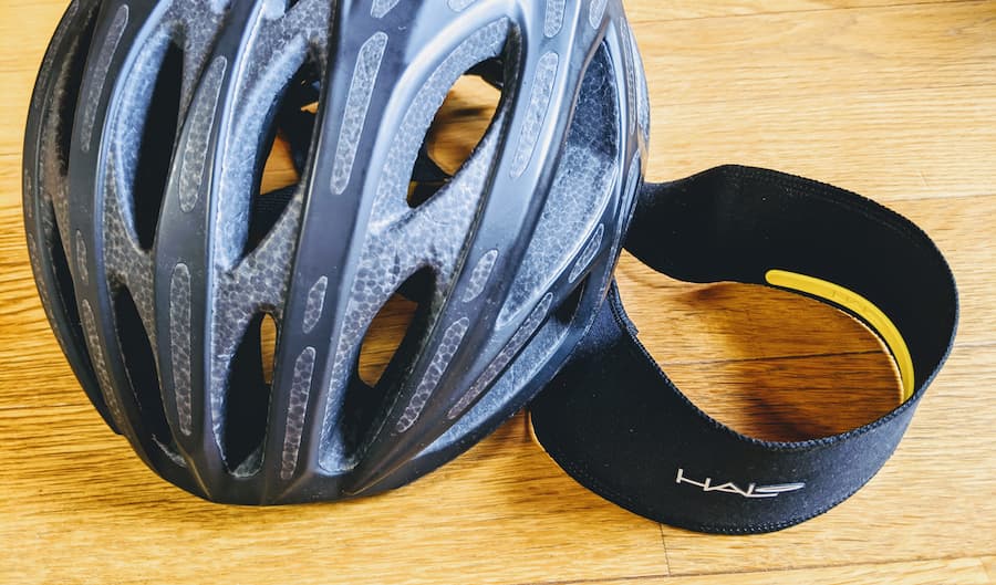 ヘルメットの下に薄型のヘッドバンドをして汗を吸わせる。だけでなくこのヘッドバンドは汗を横に流す効果もある。