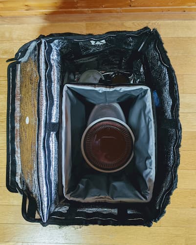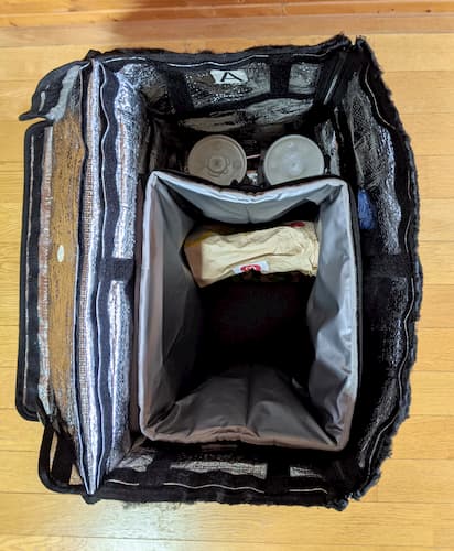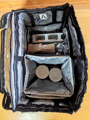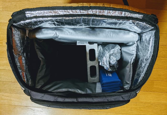 相変わらずジャストフィットの15L。配達バッグとの間に壁ができて倒れる危険性も減るし温冷分けられる。