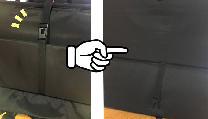 手順1: サイドの板を抜く 横に板が入っているので、バッグを開けて左右の袋を開けて板をとり出す。