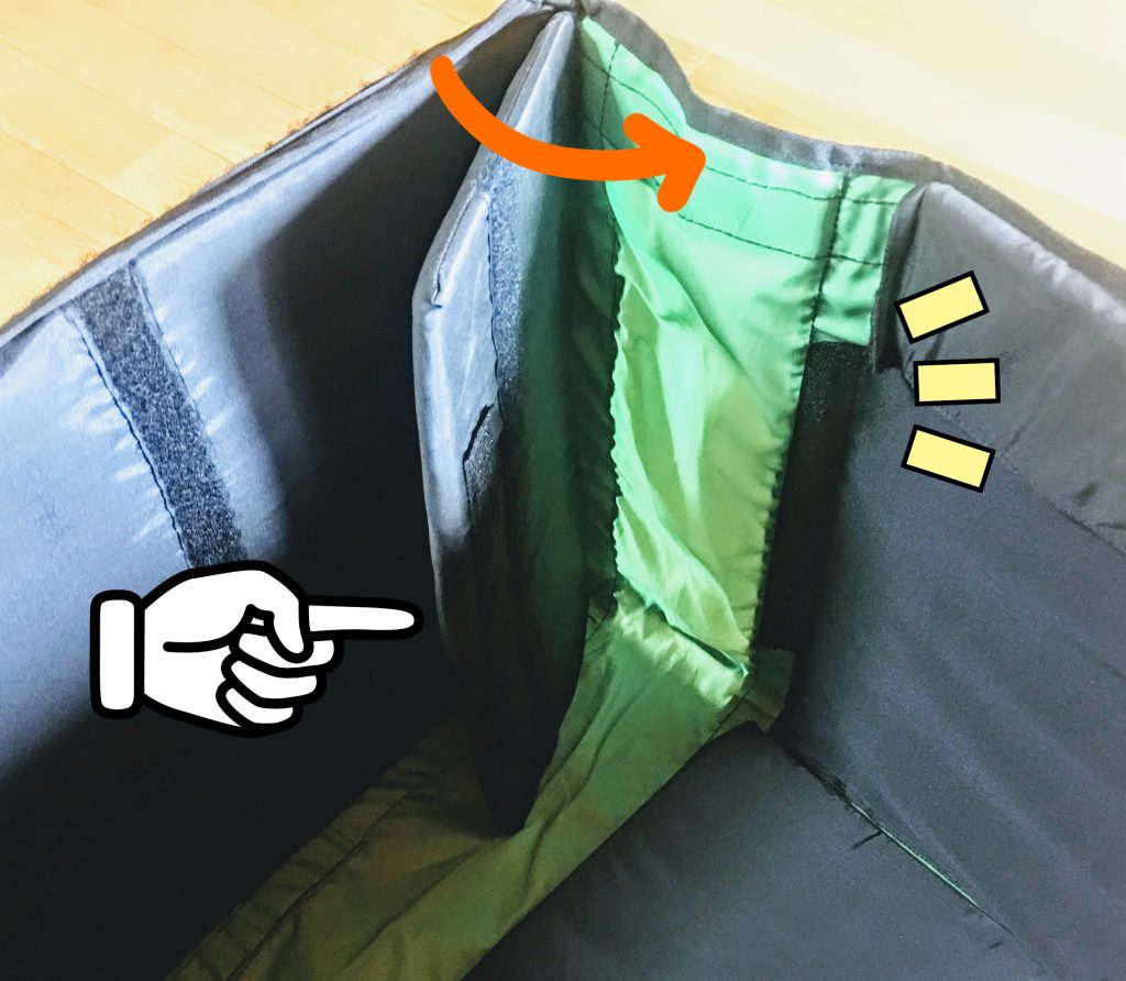 手順3: 中の横板を広げる 正面から横に90度板を開き、横面を拡張しマジックテープで止める。左右やります。