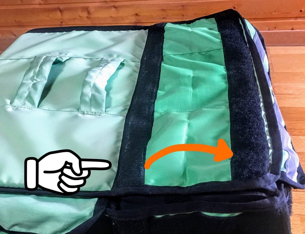 手順6: 蓋のマジックテープをはがし広げる 蓋のマジックテープをはがし拡張します。ダルダルですけど。