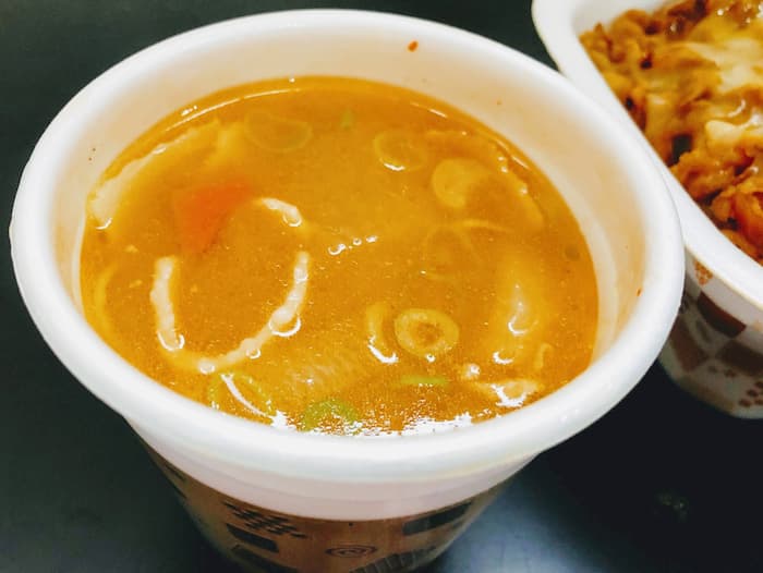 さぁ、ここらでセットの豚汁で舌を休めよう。舌が蕩けちまう前に。