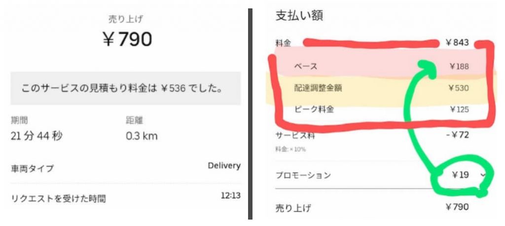 **あらかじめ計算された時間を超えるピック待ちやドロップでは見積もり多く加算される。**素晴らしい改善だ。今まで住所不備や廃棄タイマー、料理待ちなどで無駄にした時間が新料金ではお金になる。