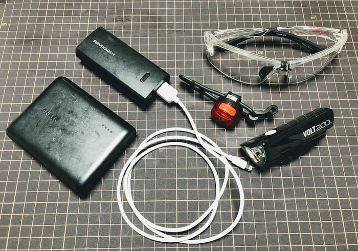 スマホバッテリー10000と5000、前後ライト、ホムセンで買ったゴーグルが必需品。すべてUSB充電可能。これをフレームバッグにポイー。