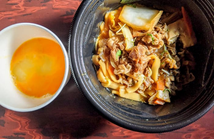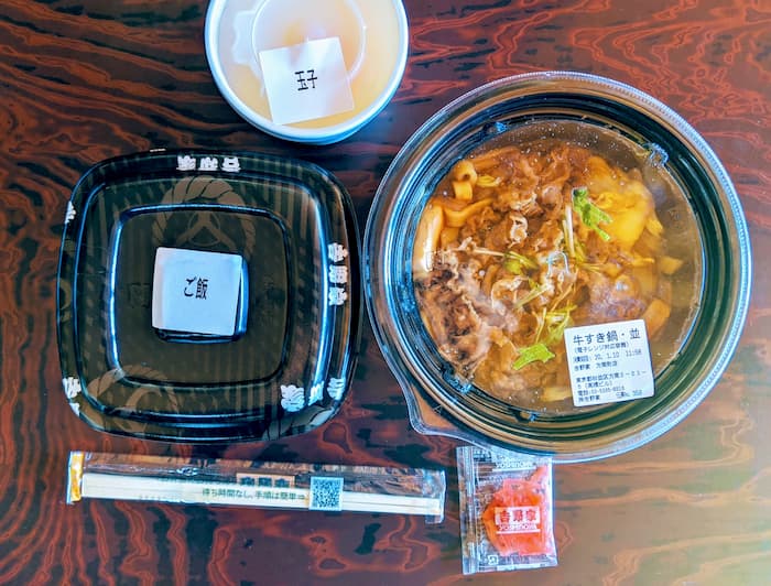 左に卵だけの容器、右に2段。下にご飯、上に牛すき鍋という重ね方だ。